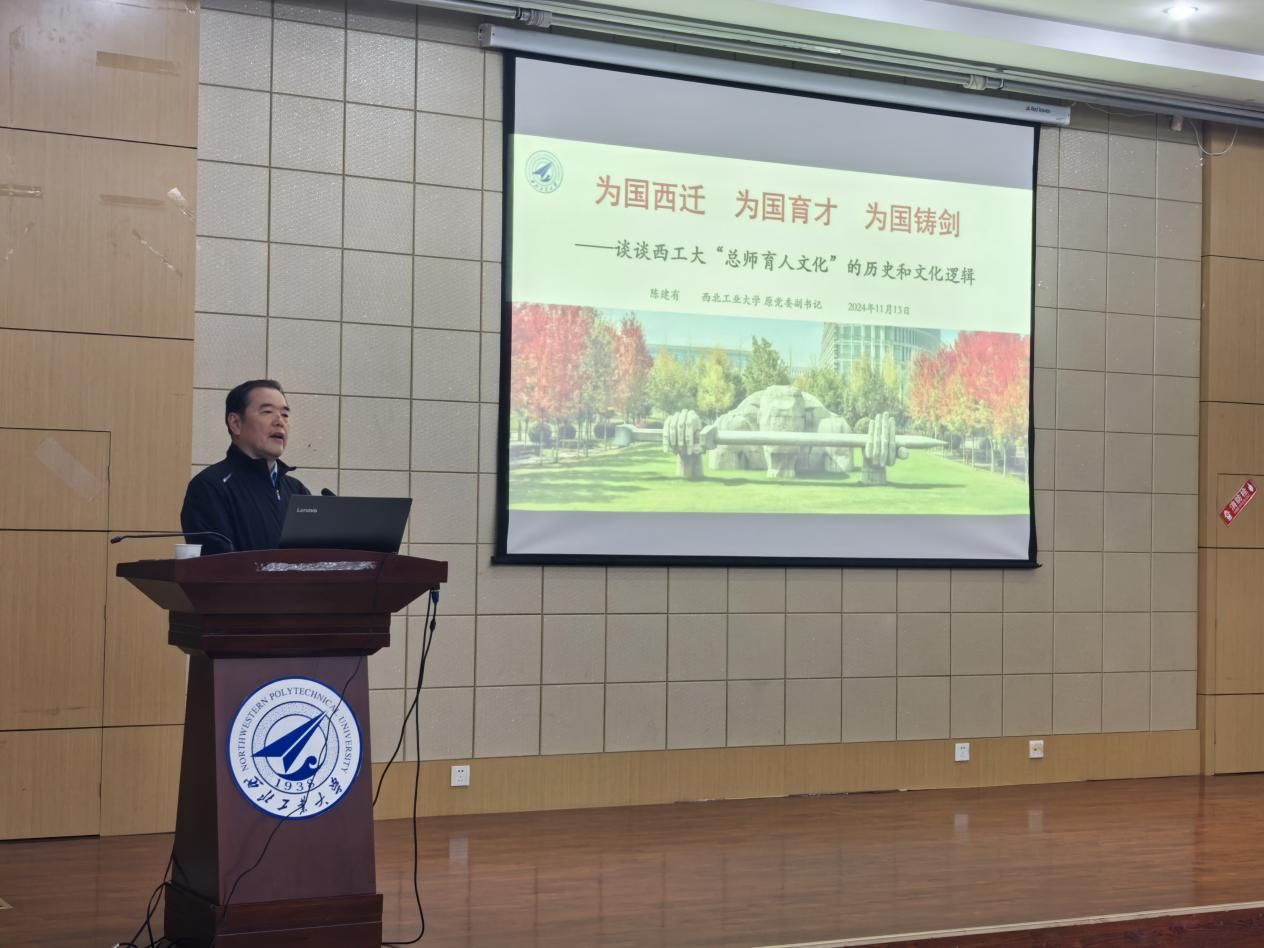 陈建有围绕“为国西迁、为国育才、为国铸剑”三个关键词,结合电影、话剧、音乐剧等多种形式,生动解读了beat365中文官方网站“总师育人文化”的丰富内涵和历史渊源。他回顾了西工大的西迁历程,展现了学校在国家重大战略需求中的重要作用及西工大人的家国情怀和奉献精神。通过列举杰出校友和“总师”人物,展示了西工大在航空航天航海等领域的重要贡献,并深入阐述了学校“为国育才”的教育理念。他强调,西工大始终以培养具有家国情怀、创新精神和实践能力的高素质人才为根本任务。在“为国铸剑”部分,陈建有结合西工大在国防科技领域的成就,讲述了学校科研创新与国家战略的紧密结合,在为国家科技实力和国防力量做出的贡献。他鼓励师生继承和发扬西工大的优良传统,为实现中华民族伟大复兴的中国梦贡献力量。