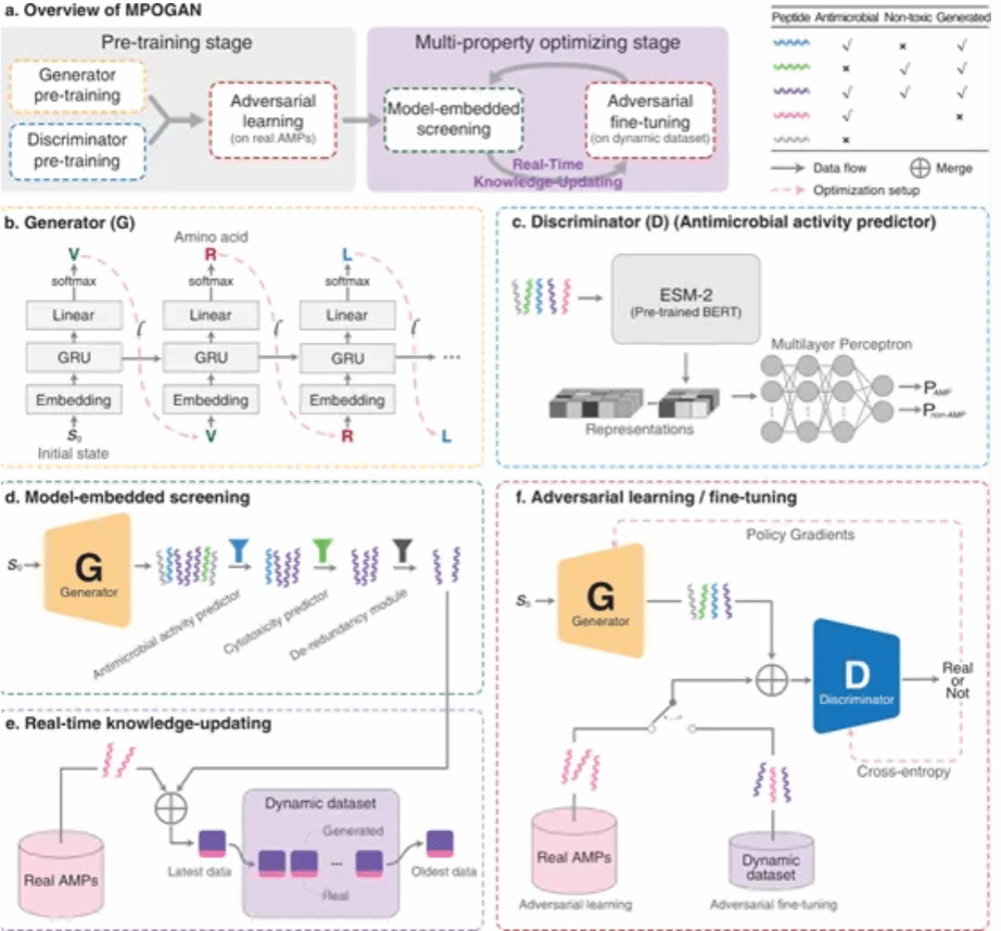 抗菌肽(AMP)是一类具有抗菌活性的小分子多肽药物,由于其广谱抗菌特性且不易诱导细菌产生耐药性,AMP成为应对全球细菌耐药性问题的重要研究方向。然而,AMP从头设计领域目前仍面临诸多挑战。实验室合成AMP的过程耗时且成本高昂;且抗菌肽不同属性之间可能存在冲突,使得现有计算方法难以同时优化多种目标特性(如抗菌活性、低毒性和序列多样性等)。为了解决这些挑战,该论文提出了面向抗菌肽多属性同步优化的生成对抗网络(MPOGAN)。通过设计嵌入式和串联式的属性评估器,筛选生成模型生成的高质量肽序列,并提出实时知识更新(RTKU)策略,动态更新训练数据集,从而迭代学习肽序列与多种治疗属性之间的关系,使生成模型逐渐具备生成具有多种优良属抗菌肽的能力。实验结果表明,MPOGAN在生成满足多种目标属性(高抗菌活性、低毒性和序列多样性)的抗菌肽方面优于现有方法。通过与beat365中文官方网站生命学院合作,研究团队合成了10条候选抗菌肽,并进行了体外测试,结果显示其中9条AMP表现出较高的抗菌活性和低细胞毒性,其中2条肽展现出强效、广谱抗菌活性和更低的细胞毒性。进一步的抗耐药菌实验、膜破裂电镜实验和分子动力学模拟结果表明,最具潜力的1条肽(MPOP-03)具有良好的安全性和选择性,并对多种耐药菌株表现出显著的抗菌活性。上述实验结果表明,MPOGAN为多属性优良抗菌肽的从头设计提供了一种高效的人工智能工具,大幅提升了生物实验验证成功率。