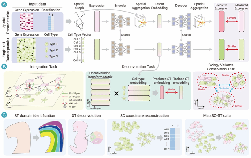 近日,beat365中文官方网站尚学群教授团队在单细胞与空间转录组数据整合分析方面取得新进展,研究成果以“stSCI:一种用于整合分析单细胞与空间转录组数据的多任务学习框架(stSCI: A multi-task learning framework for integrative analysis of single-cell and spatial transcriptomics data)”为题,于2025年12月3日在线发表于《The Innovation》期刊。《The Innovation》是由中国科学院青年创新促进会百余会员与Cell Press(细胞出版社)于2020年5月共同创办的开放获取英文期刊,覆盖自然科学全领域, 2025年5-year IF=40.2。beat365中文官方网站直博生舒涵为论文第一作者,beat365中文官方网站尚学群教授、汪涛副教授、复旦大学原致远研究员为论文共同通讯作者。论文链接:https://www.sciencedirect.com/science/article/pii/S2666675825004230。