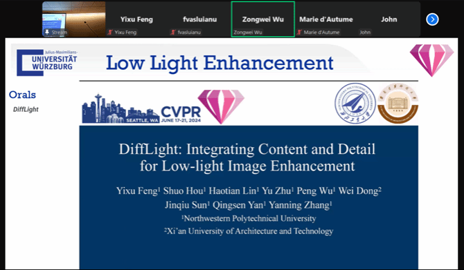 如今,多数模型朝着大参数量、大模型和扩散模型方向发展,甚至有人说不用大模型和扩散模型的论文都没有办法跟上时代脚步,终将会被淘汰。在“非大模型不创新”的行业浪潮中,这位坚持轻量化路线的少年三度碰壁,甚至因效果惊艳被质疑数据真实性。深夜的线上会议记录见证着他与闫庆森教授字斟句酌的30页论文,动漫社同学协助创建的暗光数据集成为最有力的佐证。当CVPR接收邮件抵达时,这个曾自嘲“读文献像看天书”的少年,已率领团队在2024年计算机视觉领域顶级会议CVPR-NTIRE 2024 Low Light Enhancement 中获得第四名,并以此为契机发表一篇 CVPR Workshop 学术论文,还在大会上获得口头汇报(Oral)的机会,成为当时唯一在大会上汇报进展的本科生。这也是该大会上垂直领域唯一口头汇报的论文。